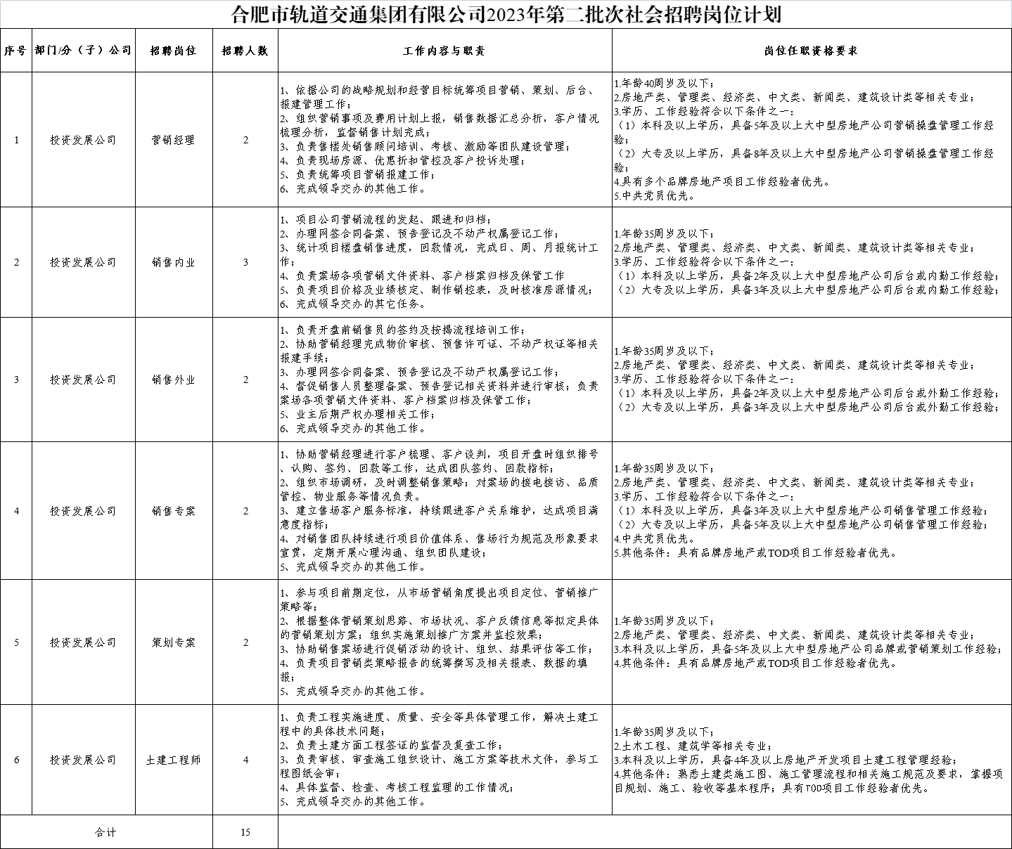 2023-05-02 12:45:20閱讀()合肥市軌道交通集團(tuán)有限公司因工作需要,現(xiàn)面向社會(huì)招聘合肥市軌道交通集團(tuán)有限公司下屬全資子公司—合肥市軌道交通投資發(fā)展有限公司部分崗位工作人員。合肥市軌道交通投資發(fā)展有限公司成立于2022年7月,注冊(cè)資本10億元,具備房地產(chǎn)開發(fā)二級(jí)資質(zhì),主要負(fù)責(zé)軌道交通沿線土地綜合開發(fā),以軌道交通場(chǎng)站為核心的TOD項(xiàng)目開發(fā)等,具體公告如下: