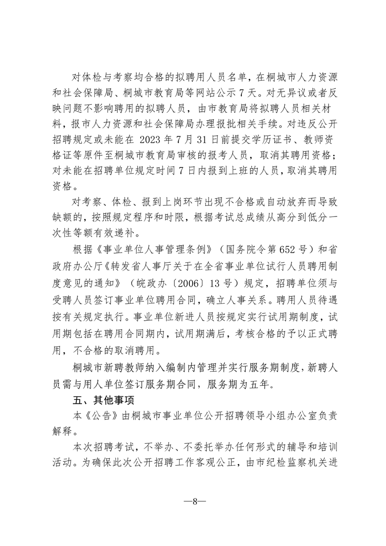 2023-06-13 17:44:37閱讀()桐城市人民政府根據(jù)《事業(yè)單位人事管理?xiàng)l例》(國(guó)務(wù)院令第652號(hào))、《安徽省事業(yè)單位公開招聘人員暫行辦法》(皖人社發(fā)〔2010〕 78號(hào)) 、《安徽省教育廳安徽省委編辦安徽省財(cái)政廳安徽省人力資源和社會(huì)保障廳關(guān)于進(jìn)一步完善中小學(xué)教師招聘制度落實(shí)市縣中小學(xué)教師招聘主體責(zé)任的通知》(皖教秘師〔2020390號(hào))等規(guī)定和要求,現(xiàn)就2023年桐城市特殊教育學(xué)校公開招聘新任教師工作有關(guān)事項(xiàng)公告如下: