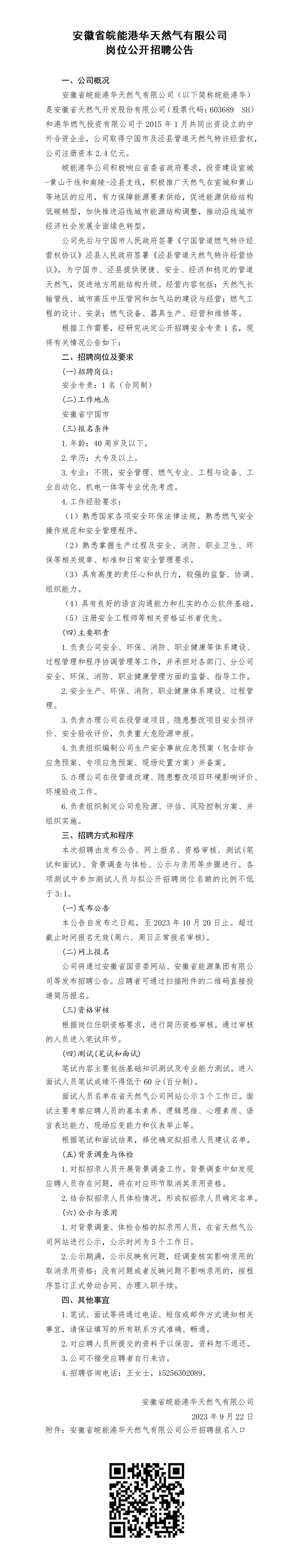 2023年安徽省皖能港華天然氣有限公司崗位公開招聘公告(二)